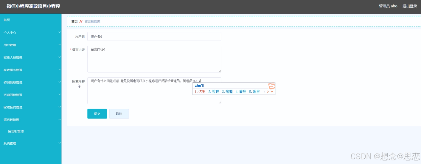 管理员可以对留言板信息进行回复和删除操作。界面如下图所示: