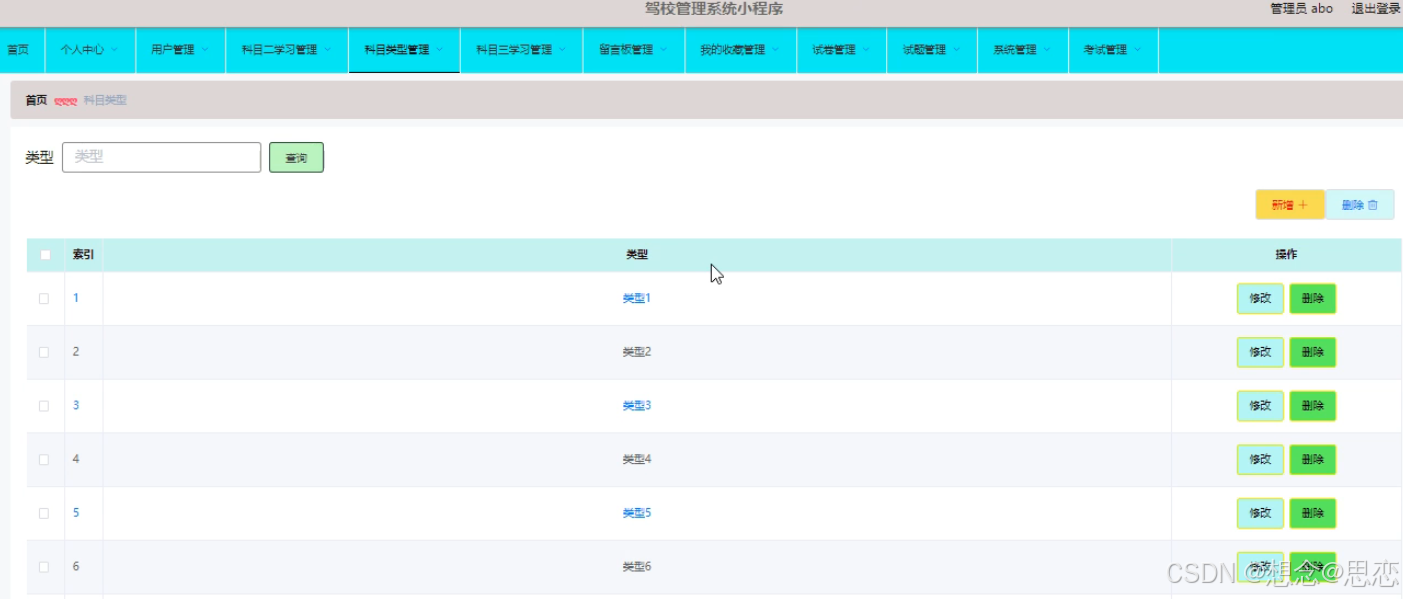 管理员可以对科目类型进行添加修改删除操作。界面如下图所示: