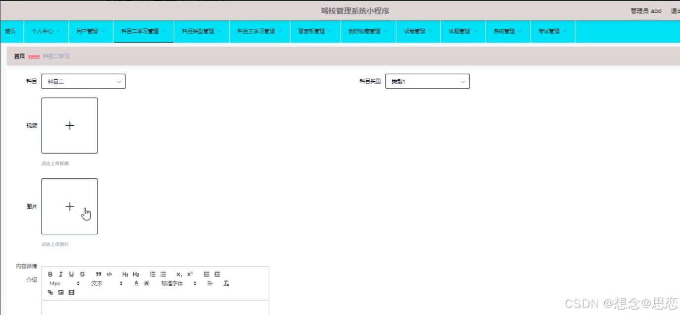 管理员可以对科目二学习进行添加,修改,查询或删除操作。具体界面如图5.2所示。