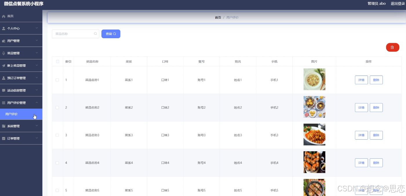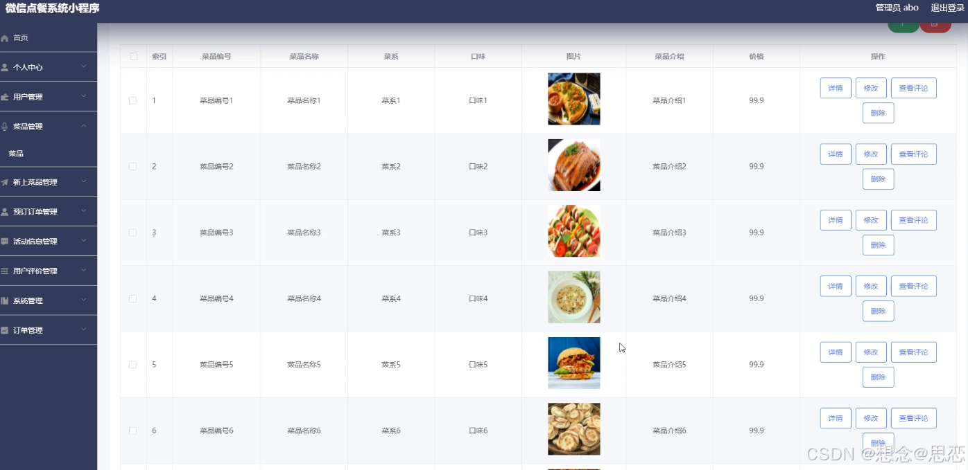 管理员可以管理菜品信息,可以对菜品信息添加修改删除。具体界面的展示如图5.1所示。