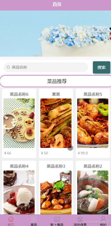 小程序用户是需要注册才可以进行登录的,登录后在首页可以搜索菜品名称,以及查看菜品,并且下面导航可以点击到其他功能模块。界面如下图所示: