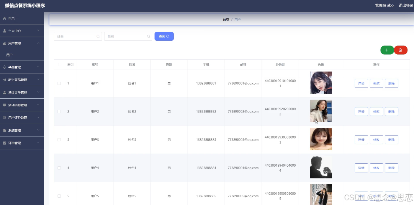 管理员可以对用户信息进行添加,查询修改,删除操作。具体界面如图5.2所示。