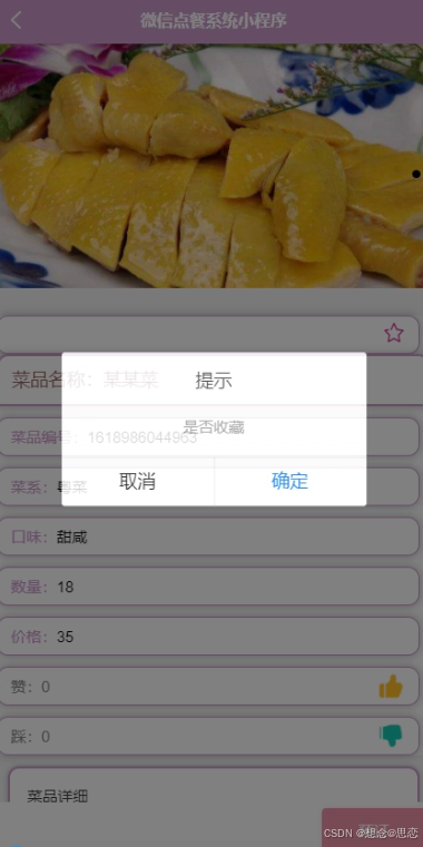 在商品详情界面,可以对商品进行收藏和预定操作,点击菜品图片右下角的五角星,是收藏操作,双击是取消,点击页面右下角的预定按钮,会进行预定操作。界面如下图所示: