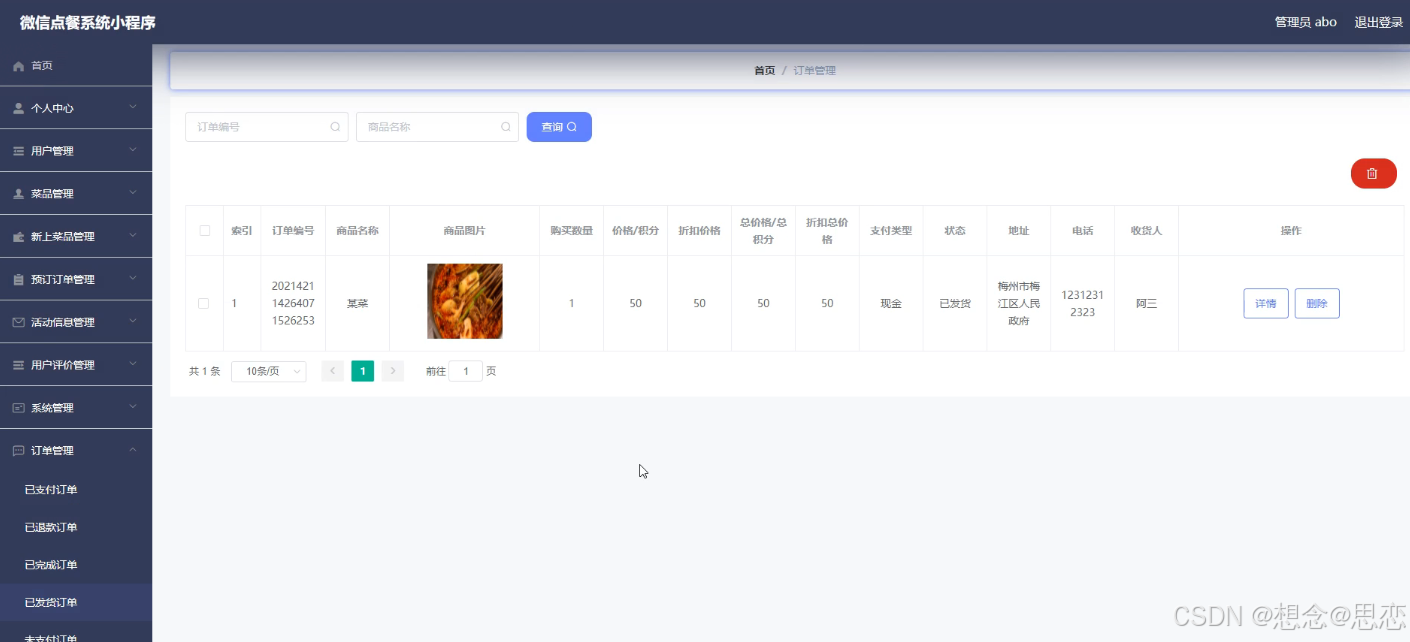 系统管理员可以对订单信息发货和查询。界面如下图所示: