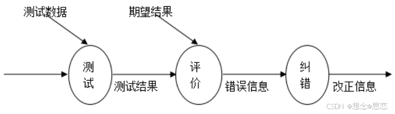任务:消除软件故障,保证程序的可靠运行。测试与纠错的关系,可以用图6-1的数据流图来说明。图中表明,每一次测试都要准备好若干必要的测试数据,与被测试程序一道送入计算机执行。通常把一次程序执行需要的测试数据,称为一个“测试用例(Test Case)。每一个测试用例产生一个相应的“测试结果”。如果它与“期望结果”不想符合,便说明程序中存在错误,需要用纠错来改正。