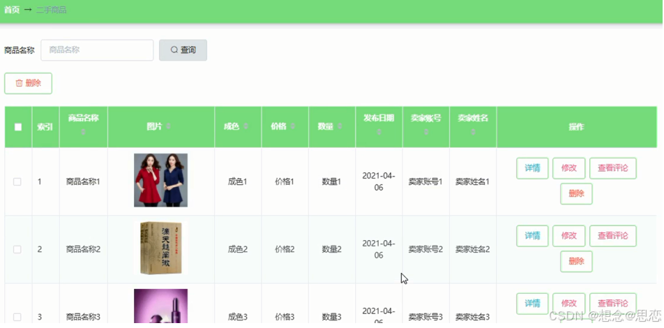 管理员可管理二手商品信息,对已有二手商品信息可进行修改和删除,二手商品管理界面展示如图5.10所示。