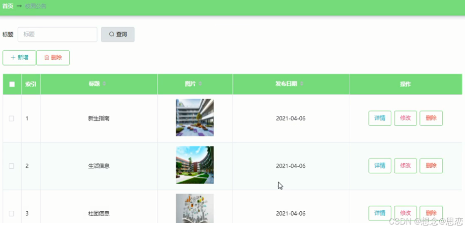 管理员可增删改查校园公告信息,校园公告管理界面展示如图5.11所示。