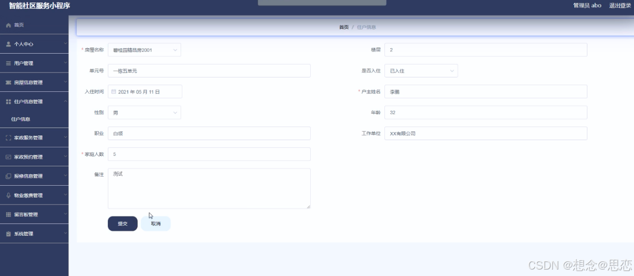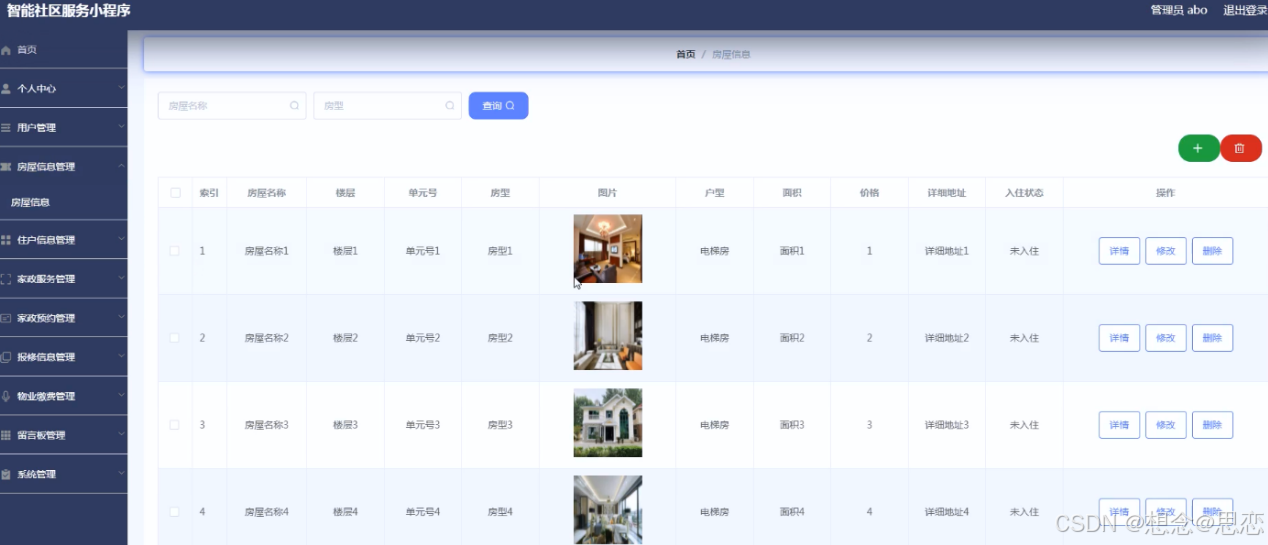 系统管理员可以对住户信息进行添加,修改,删除以及查询操作。界面如下图所示: