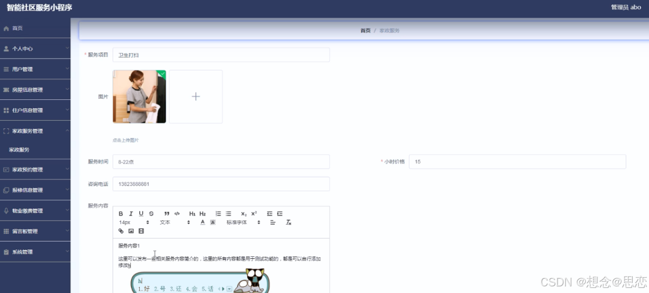 系统管理员可以对家政服务进行添加修改删除操作。界面如下图所示: