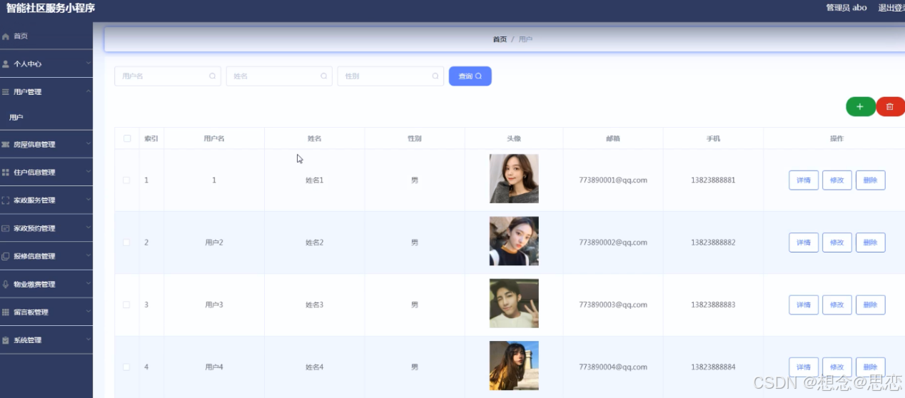 智能社区服务小程序的系统管理员可以管理用户,可以对用户信息修改删除以及查询操作。具体界面的展示如图5.1所示。