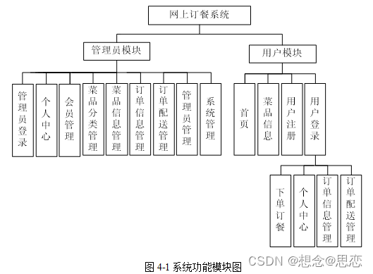 本基于Spring Boot的网上订餐系统主要管理员模块以及用户模块两大部分,系统结构图如图4-1所示。