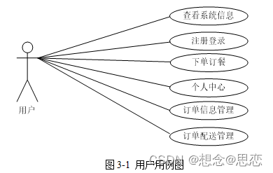 用户进入本系统可查看系统信息,包括首页、菜品信息等,用户要想实现下单订餐操作,必须登录系统,未有账号的用户可进行注册,注册登录后主要功能模块包括个人中心、订单信息管理以及订单配送管理,用户用例图如图3-1所示。