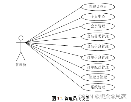 管理员登录后可对系统进行全面管理,管理员主要实现的功能模块包括个人中心、会员管理、菜品分类管理、菜品信息管理、订单信息管理、订单配送管理、管理员管理以及系统管理,管理员用例图如图3-2所示。