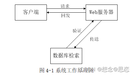 本系统采用B/S结构(Browser/Server,浏览器/服务器结构)和基于Web服务两种模式,是一个适用于Internet环境下的模型结构。只要用户能连上Internet,便可以在任何时间、任何地点使用。系统工作原理图如图4-1所示: