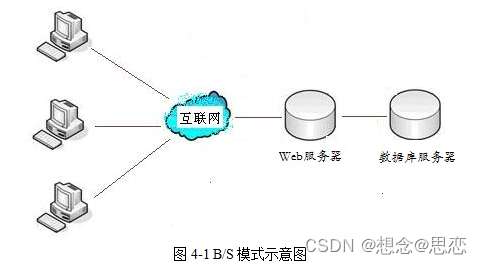 B/S系统架构是本系统开发采用的结构模式,使用B/S模式开发程序以及程序后期维护层面需要的经济成本是很低的,用户能够承担得起。使用这样的模式开发,用户使用起来舒心愉悦,不会觉得别扭,操作很容易就熟练了。而且方便管理。采用B/S体系结构开发的应用软件仅仅需要在客户端安装谷歌浏览器或者其他浏览器就可以操作,对于维护和升级操作则在服务器端就能完成,不用在客户端进行操作,这样就节省了许多开销,B/S模式能够保证软件应用的跨平台性和通用性,采用它开发软件是最佳选择。B/S模式示意图如图4-1所示。