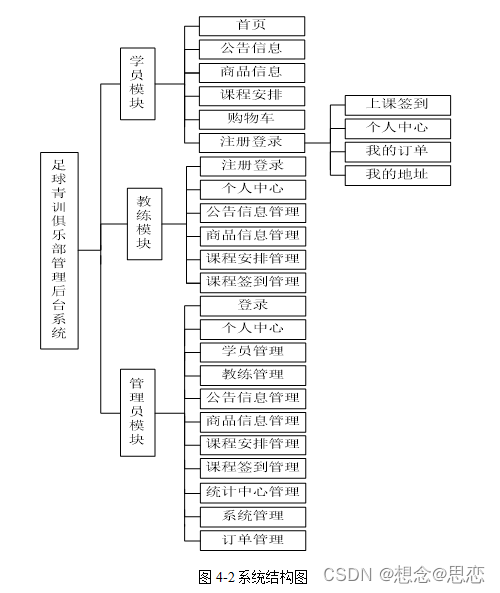 本基于Springboot的足球青训俱乐部管理后台系统由学员功能模块、教练功能模块和管理员功能模块三大部分构成,系统的结构图如图4-2所示。