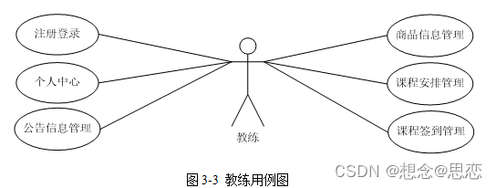 教练注册登录后主要功能模块包括个人中心、公告信息管理、商品信息管理、课程安排管理以及课程签到管理。