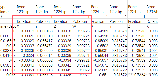 如图,是motive导出的csv文件中的人体骨骼数据,我认为它是各个关节的局部坐标和世界坐标转化的一个旋转 ,因此做了实验