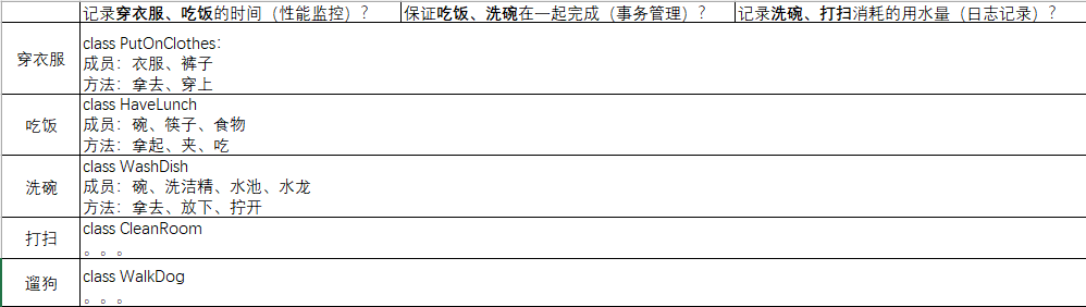 面向对象编程OPP完成了穿衣、吃饭、洗碗等这些功能,但从另一个维度去控制这些功能,比如“查看穿衣服、吃饭的时间(性能监控)”、“保证吃饭、洗碗连在一起完成(事务管理)”、“记录洗碗、打扫消耗的用水量(日志记录)”这些就是面向切面编程AOP