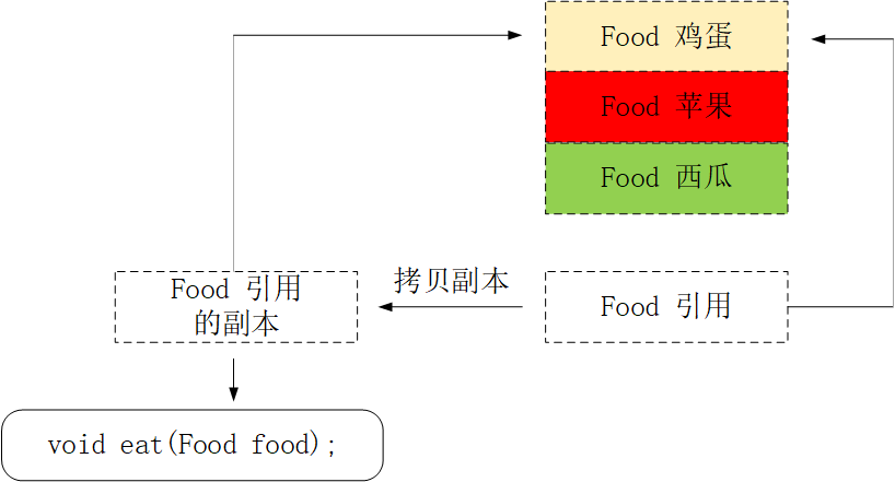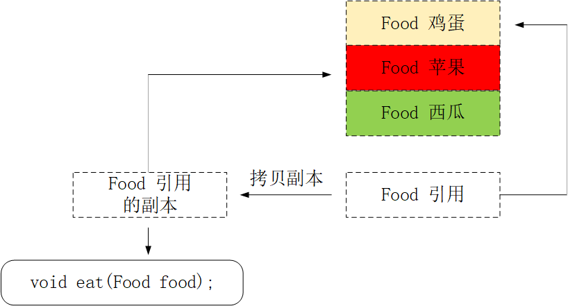 看到区别了吗,引用传递可以在eat()内部修改“Food 引用”本身,让其转而引用“Food 苹果”;值传递,在eat()内部只能修改“Food 引用的副本”,不能修改“Food 引用”本身。
