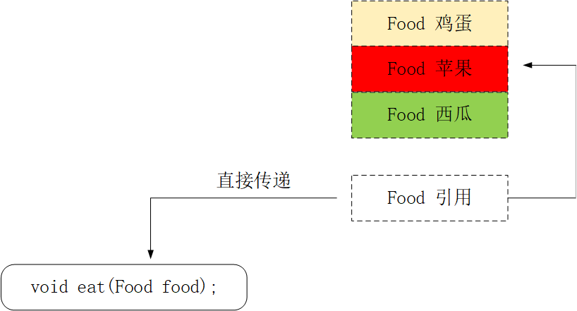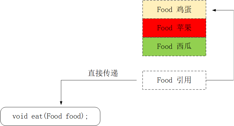我有一个类Food,三个对象Food 鸡蛋、Food 苹果、Food 西瓜,一个引用Food 引用,一个方法 void eat(Food food)