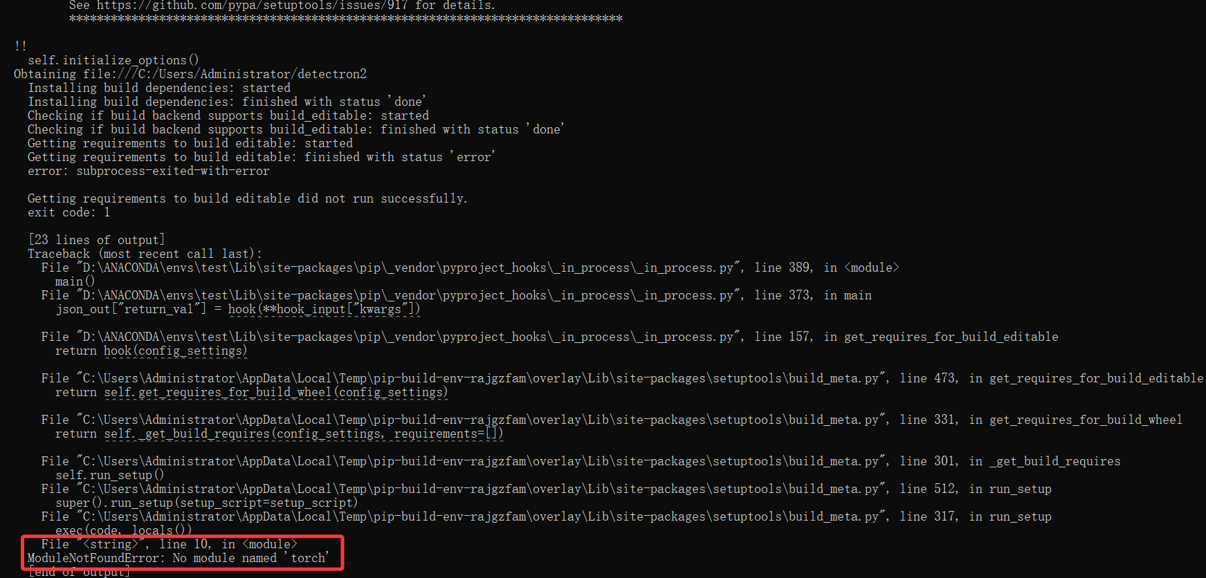 这样做是为了 隔离依赖冲突。 Detectron2 的 setup.py 会 import torch。但在临时构建环境中,没有 torch(pip 不会带上你的原始环境依赖)。所以会报: