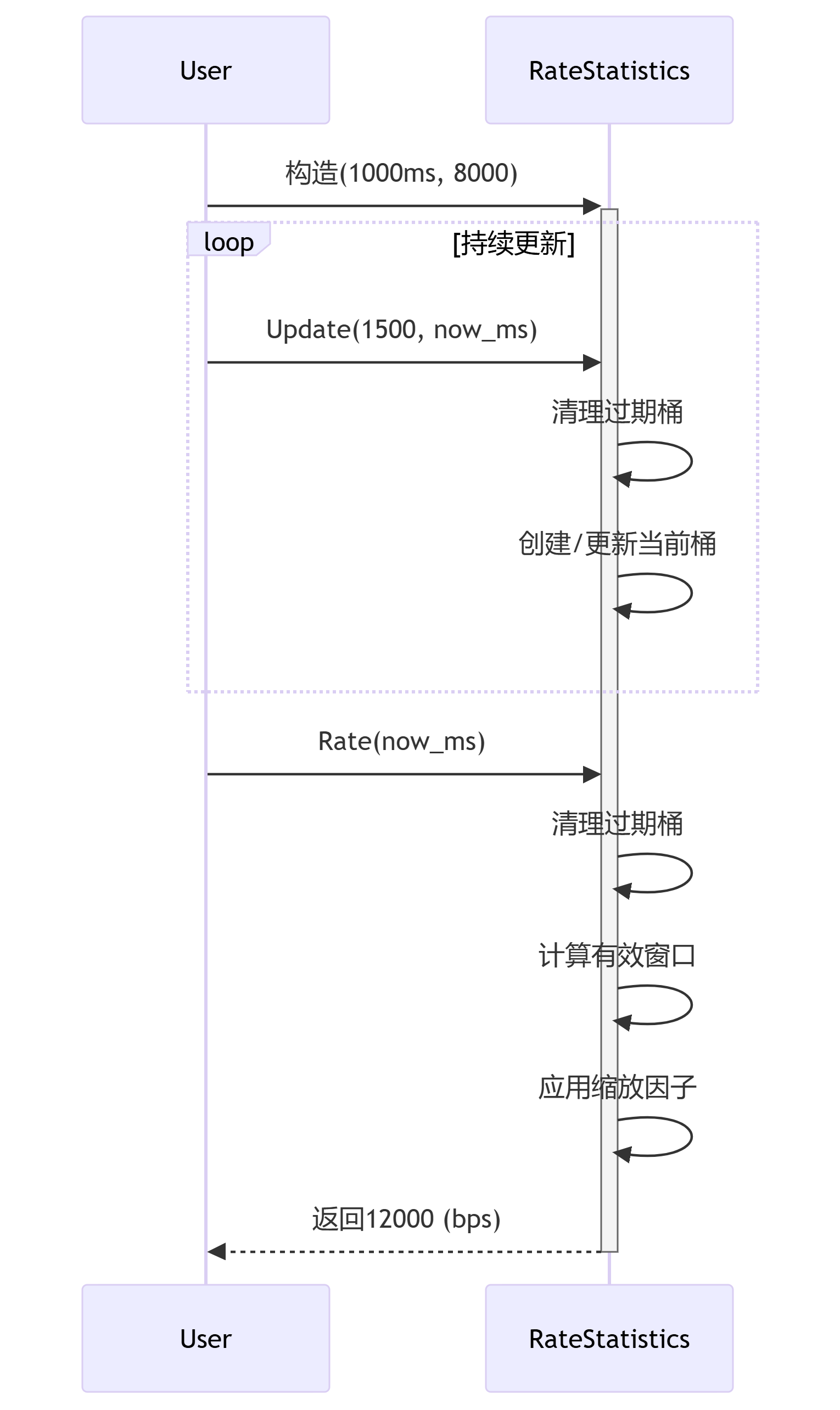 rate_stat.Update(1500, t1); // 收到1500字节 rate_stat.Update(2000, t2); // 2000字节