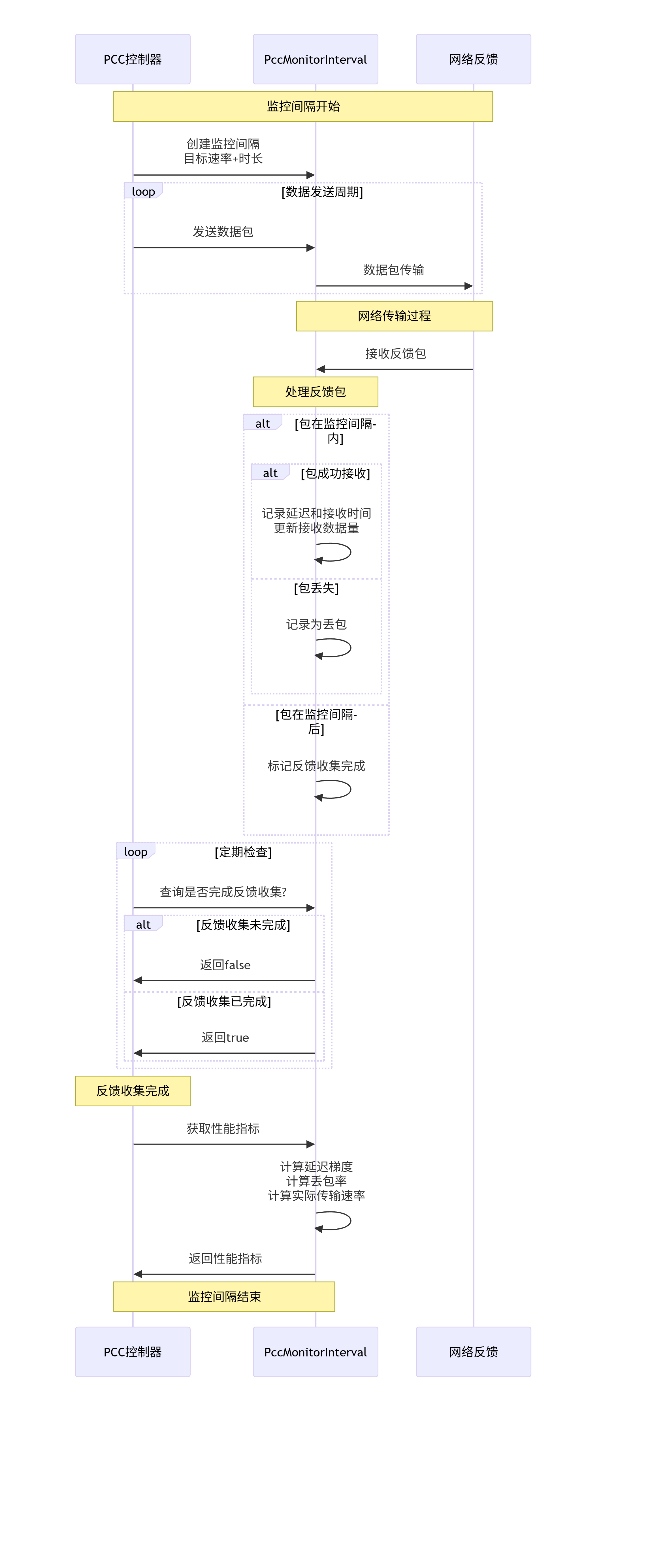 PccMonitorInterval 类是 PCC (Performance-oriented Congestion Control) 拥塞控制算法的核心组件,用于监控特定发送速率下的网络性能表现。主要功能包括:
