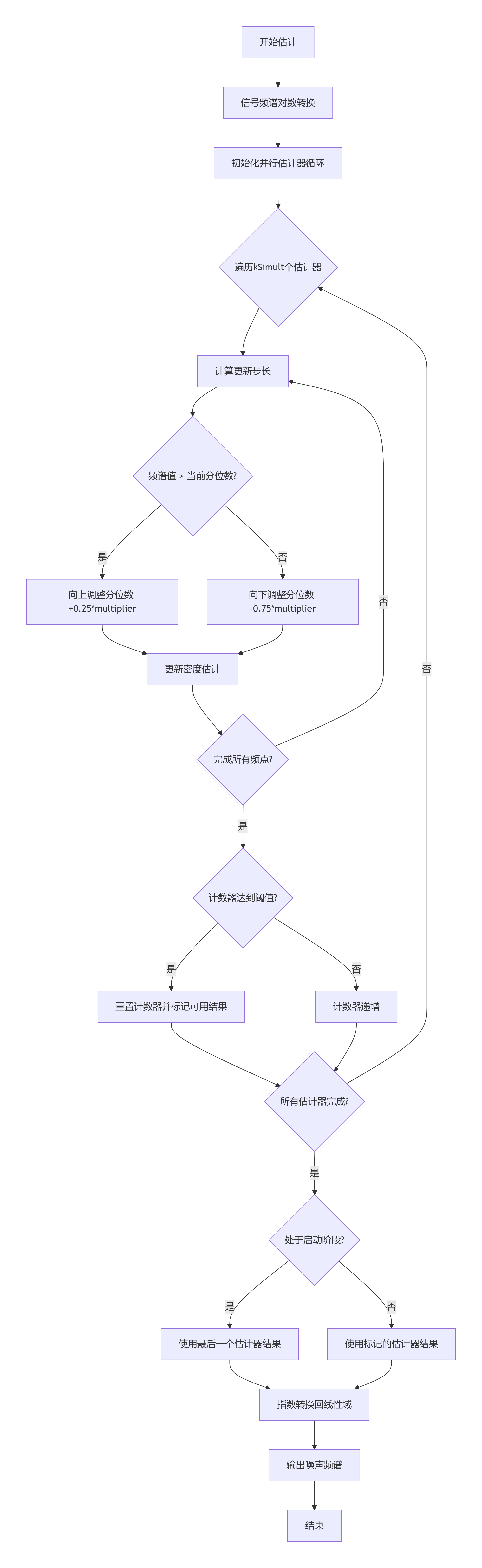 调用者 QuantileNoiseEstimator | | |--Estimate()------->| | |--LogApproximation() | |--for s=0 to kSimult-1 | | |--更新分位数估计 | | |--更新密度估计 | | |--检查计数器 | |<-- | |--启动阶段检查 | |--ExpApproximation() | |--复制结果 |<--noise_spectrum---|