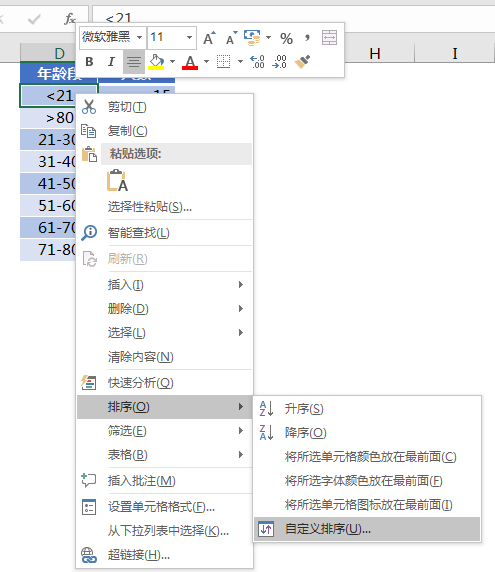 可是,可是… 这个排序结果却不是我们想要的结果,比如上图中的年龄段排序。此时就要用到自定义序列,一起来看看这个貌似很高大上的功能了,其实操作也很简单:右键快捷菜单上选择排序>>自定义排序。