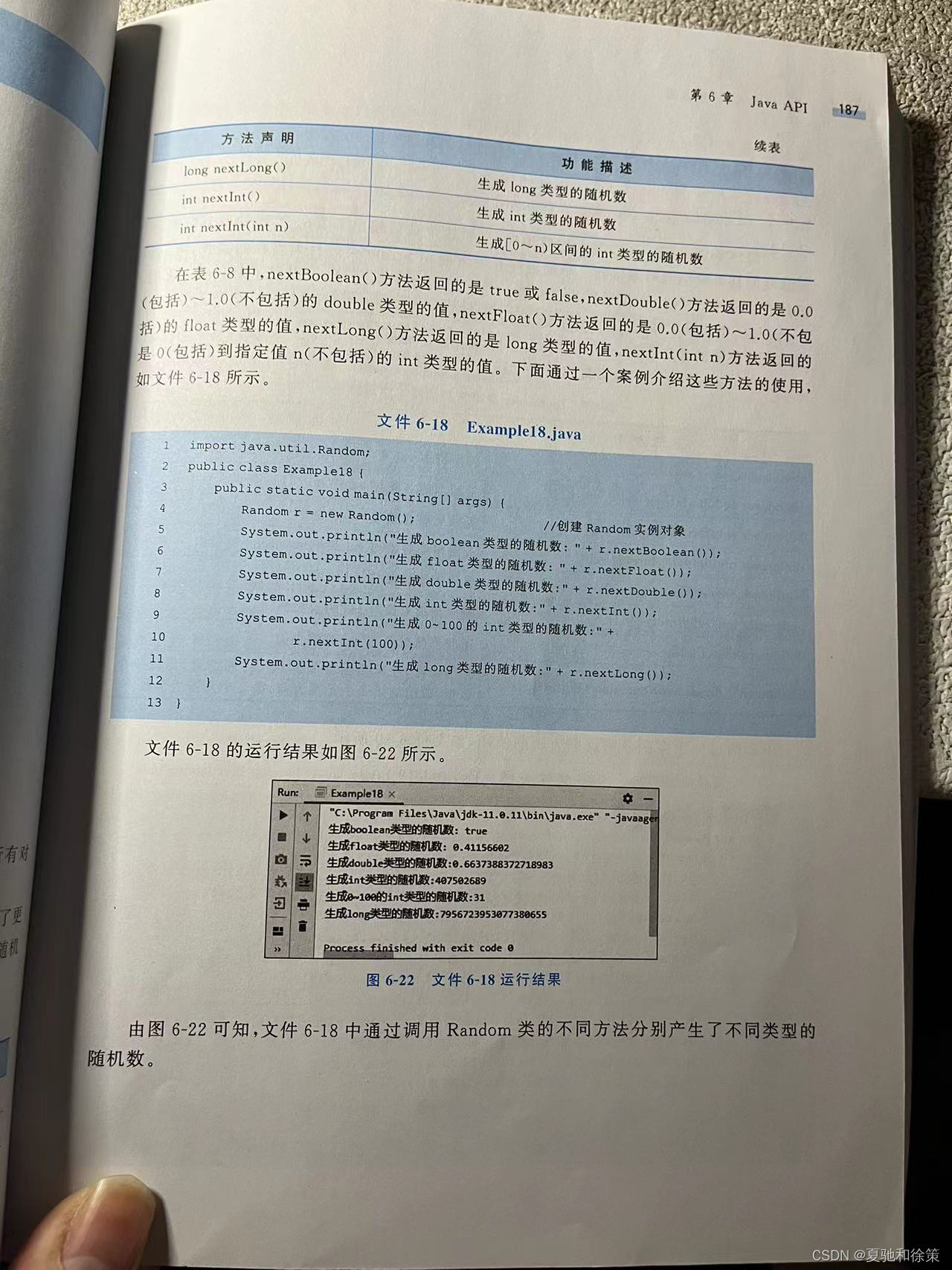 nextBoolean(): 生成布尔类型随机数。nextDouble(): 生成双精度浮点类型随机数。nextFloat(): 生成浮点类型随机数。nextInt(): 生成整型随机数。nextInt(int n): 生成[0,n)区间的整型随机数。nextLong(): 生成长整型随机数。