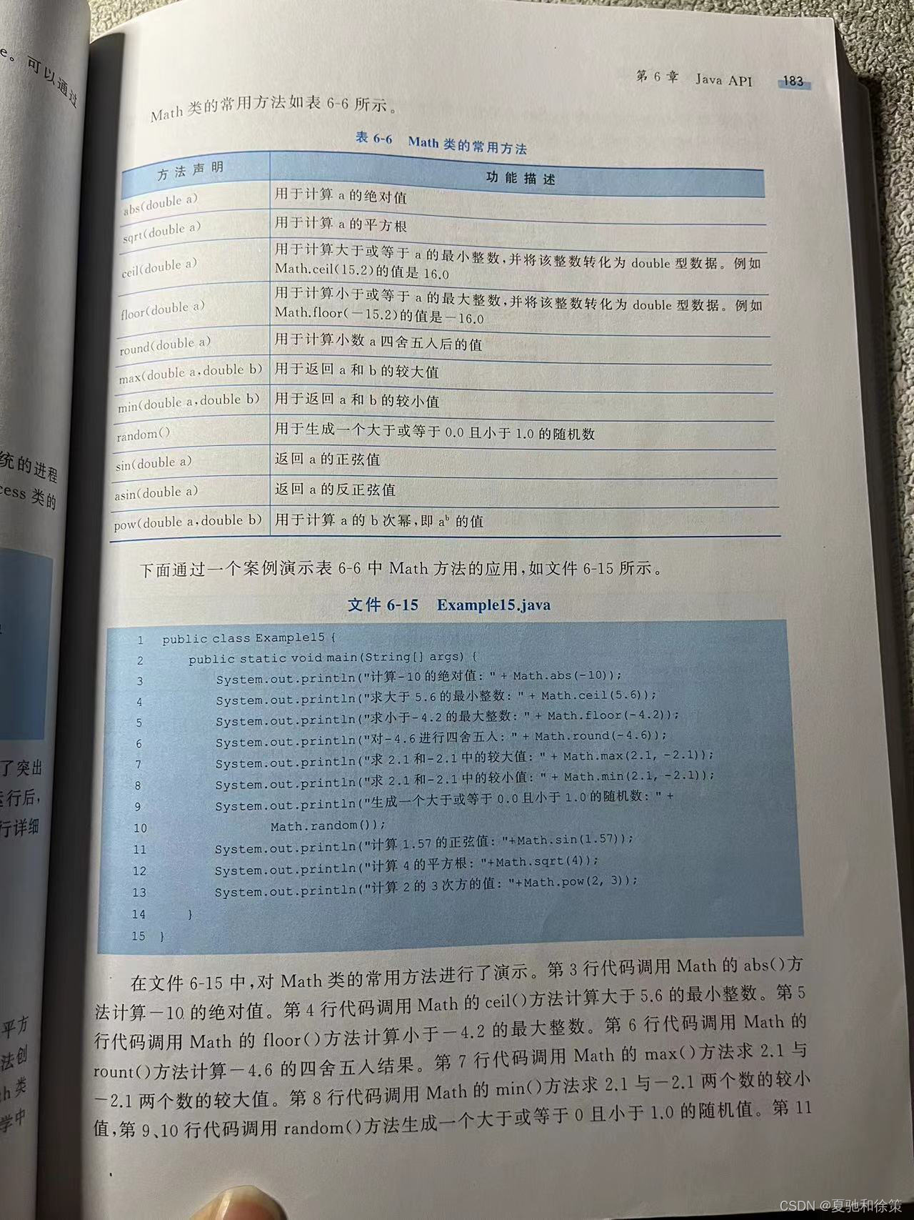 - 这一节深入探讨了Math类的多种功能,提供了一个强大的工具集合,用于处理各种数学运算和数值计算。通过示例代码,可以看到这些方法在实际编程中的应用。