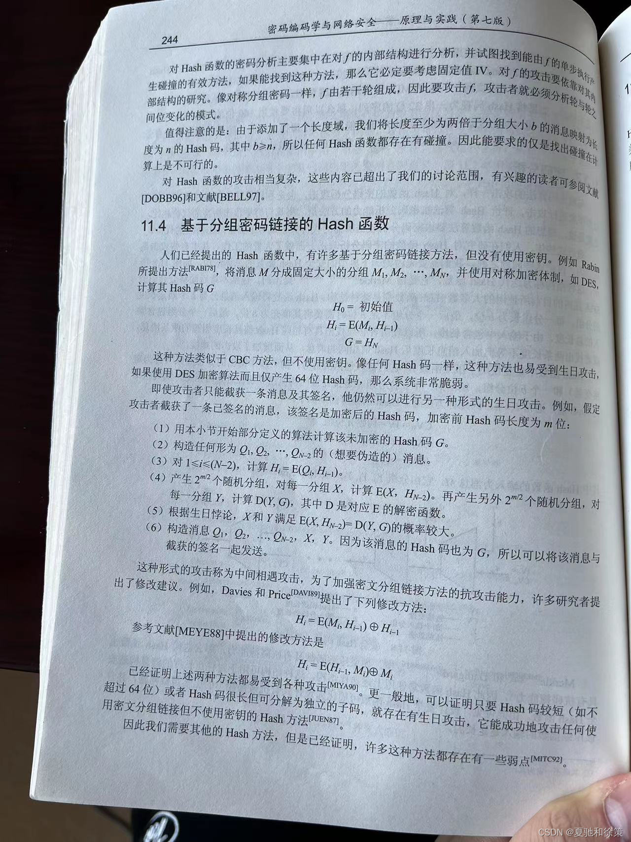 - 问题描述: 像许多Hash码一样,基于分组密码链接的Hash方法也容易受到生日攻击。尤其是如果使用DES并只产生64位的Hash码,系统将非常脆弱。