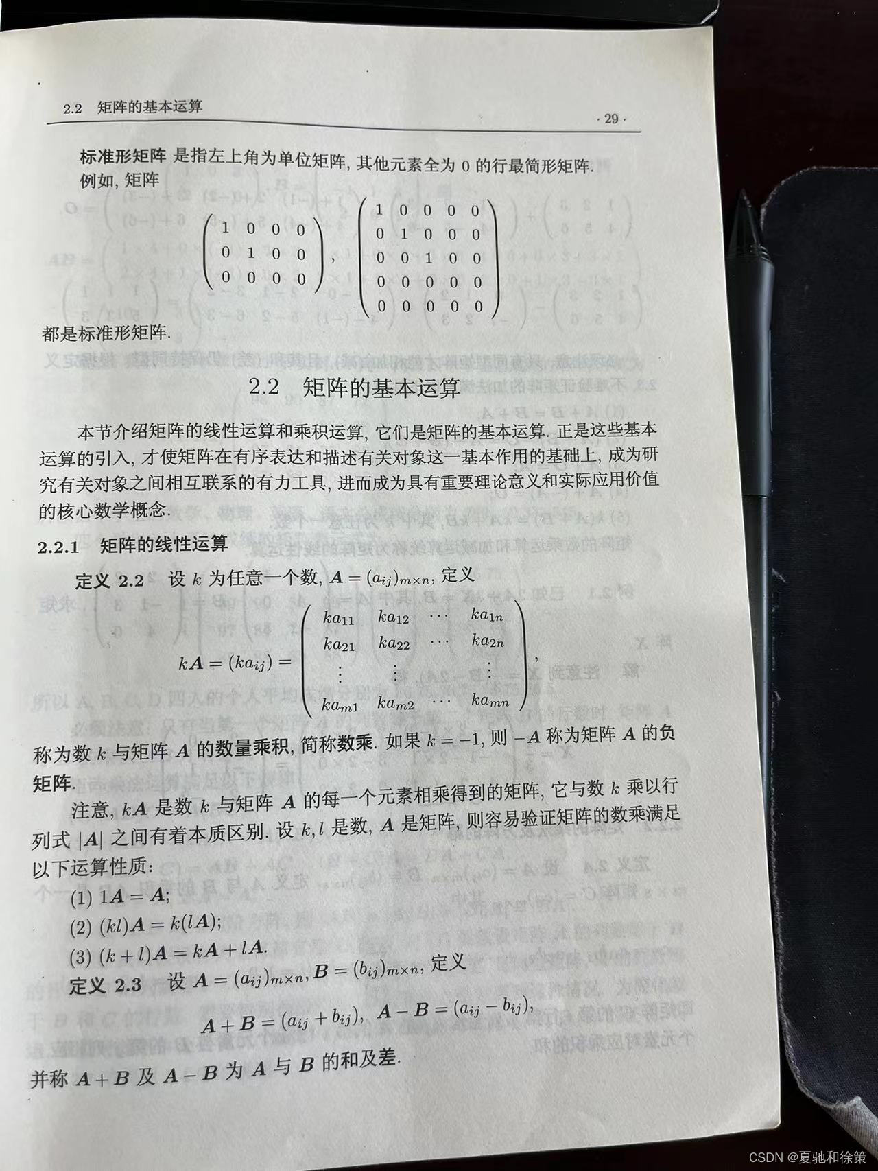 本节介绍矩阵的线性运算和乘积运算,它们是矩阵的基本运算。正是这些基本运算的引入,才使矩阵在有序表达和描述有关对象这一基本作用的基础上,成为研究有关对象之间相互联系的有力工具,进而成为具有重要理论意义和实际应用价值的核心数学概念。