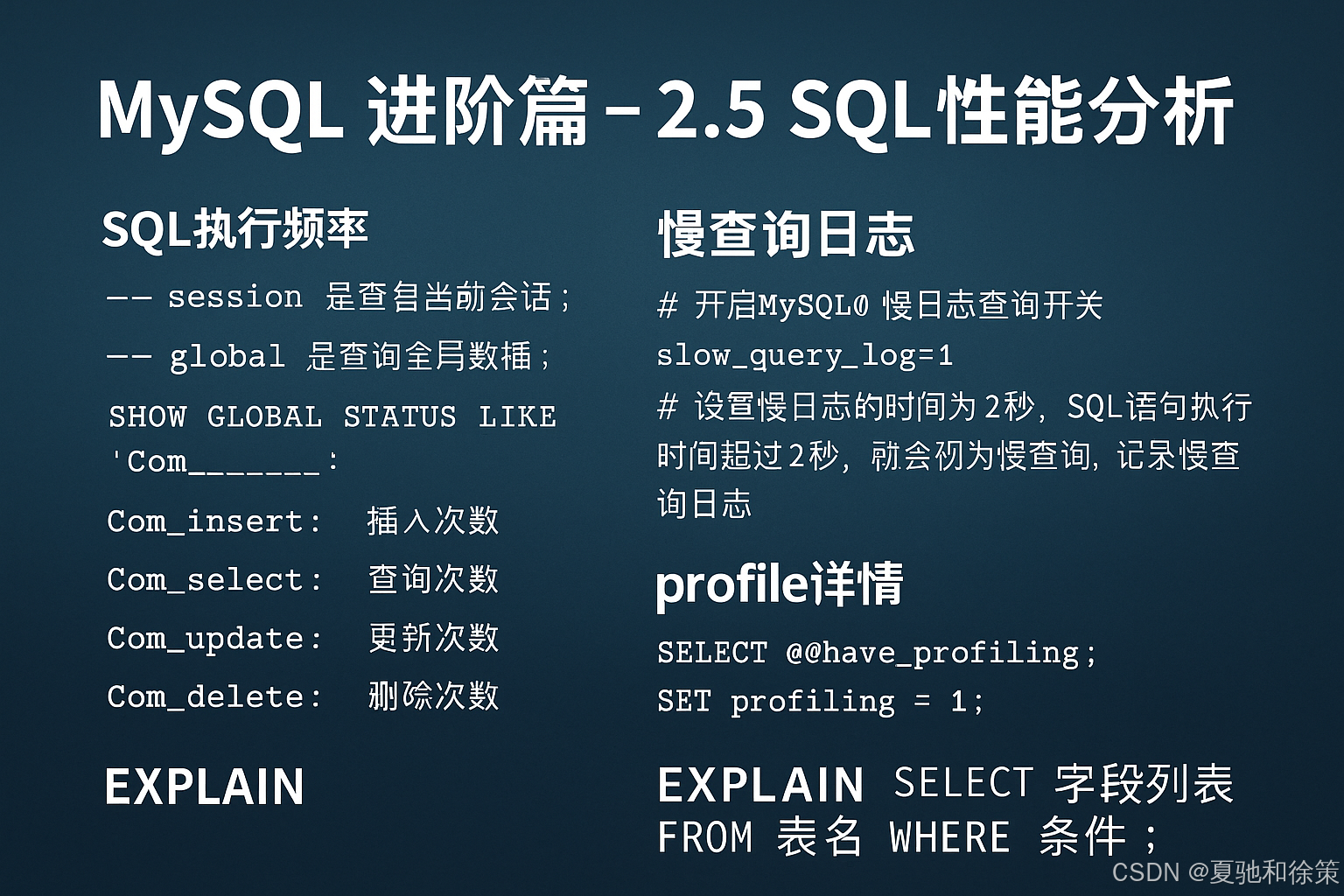 在日常开发与数据库优化过程中,SQL 的执行效率往往决定了系统的整体性能。本节将从 执行频率、慢查询日志、Profile 详情、Explain 执行计划 四个角度入手,分析 SQL 的性能瓶颈与优化方法。