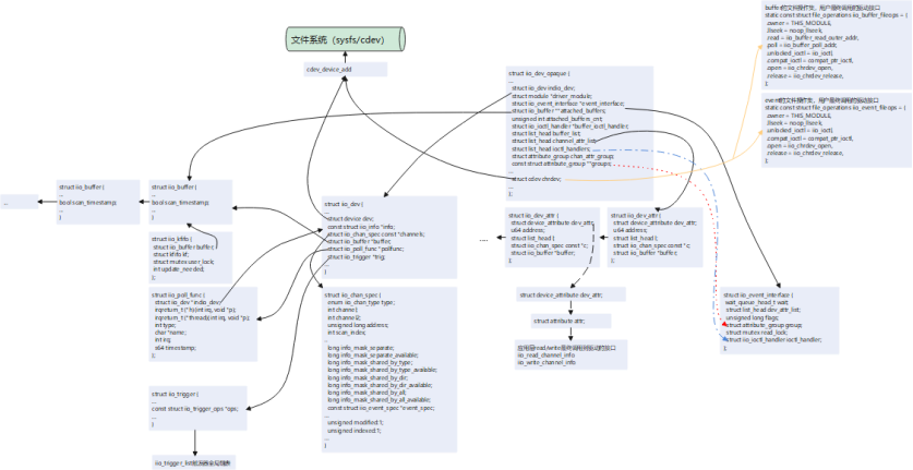 如下是IIO子系统在Linux中大致位置及框架组成。IIO子系统通过cdev设备向文件系统注册设备提供应用层访问IIO子系统的接口,也使用sysfs框架向应用层提供在Linux文件系统中修改访问的接口,前者在用户驱动使用trigger或buffer模式时使用,后者则在direct模型下使用。IIO子系统内主要用core、trigger、buffer和event几个模块组成,用户驱动根据自身需求,使用IIO子系统提供的注册接口,向子系统注册对应的channel信息以及访问的接口,这些信息与接口将有子系统在用户访问时分配访问和回调。