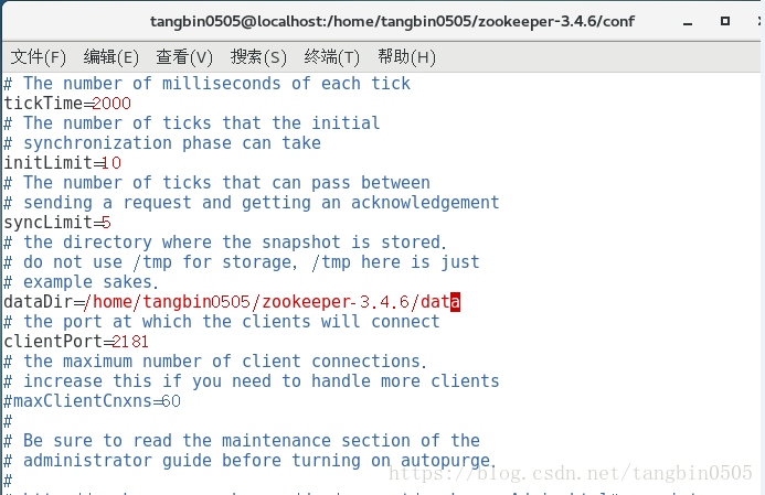 第七步:修改zoo.cfg,把路径改成 /home/tangbin0505/zookeeper-3.4.6/data