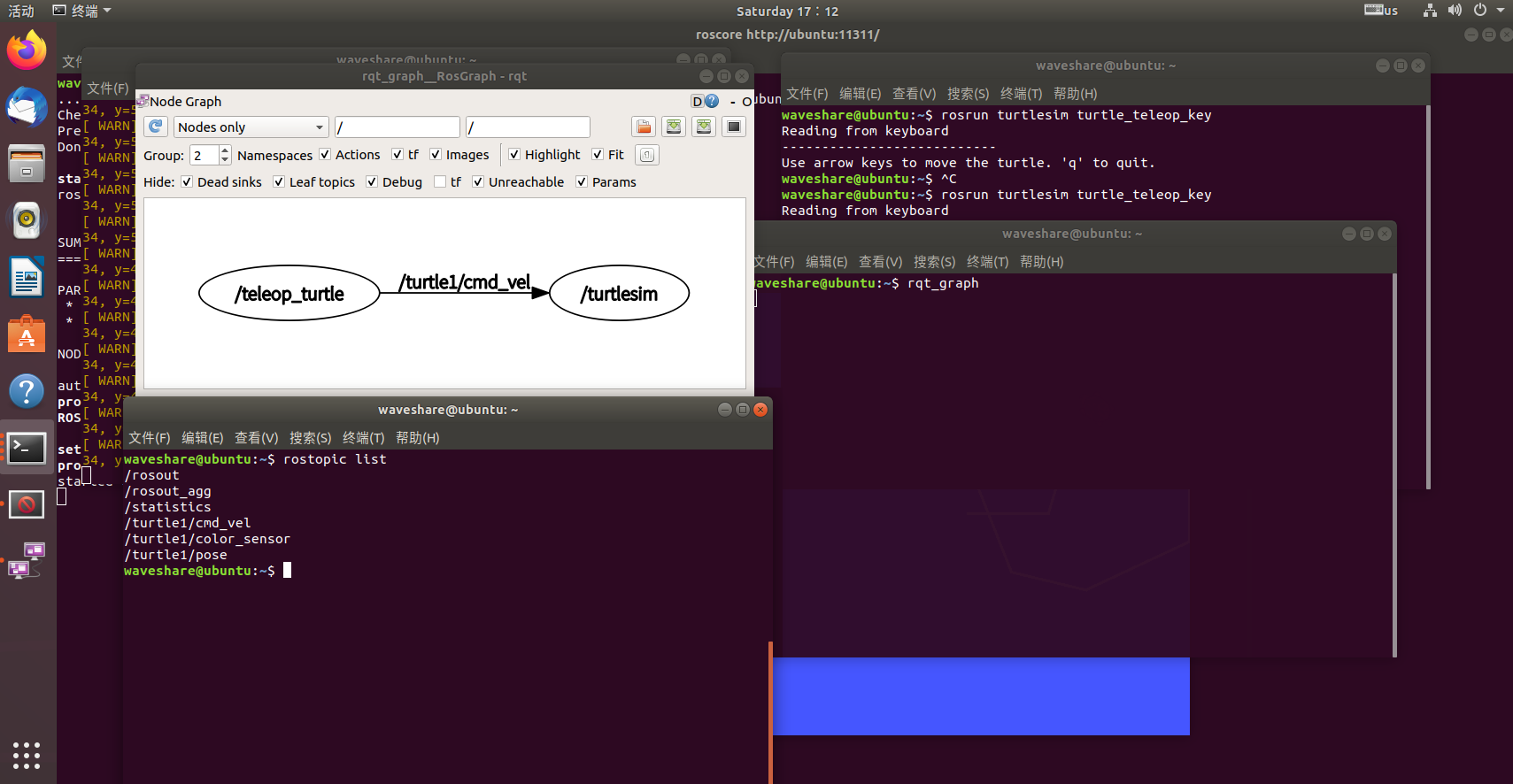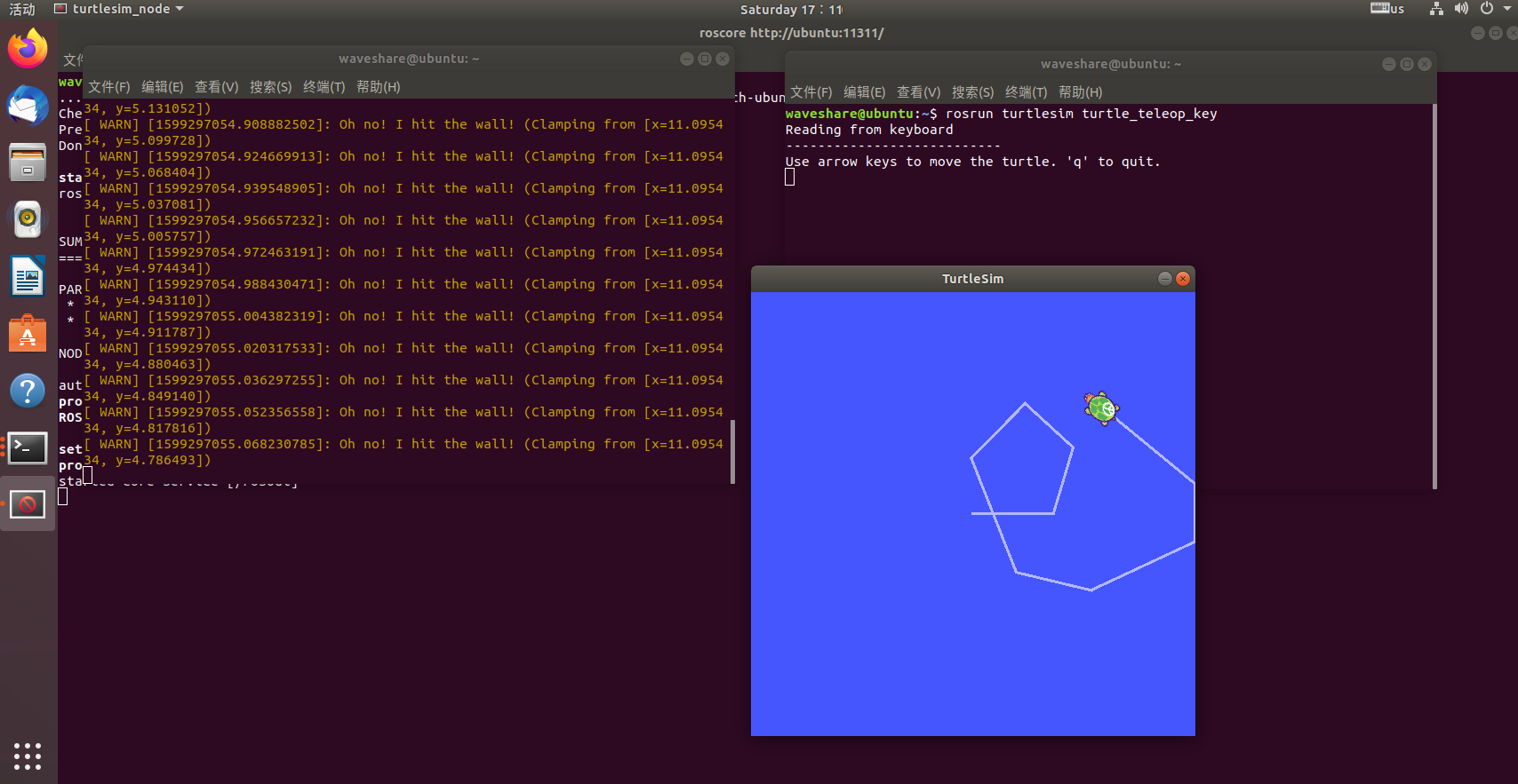 来启动键盘控制,通 过↑、↓、←、→来控制小乌龟的移动。 我们可以看到,在小海龟的gui头“撞墙”的时候,我们的turtlesim_node节点(咳咳,概念型的请继续关注接下来的内容)会有提示数据的输出。