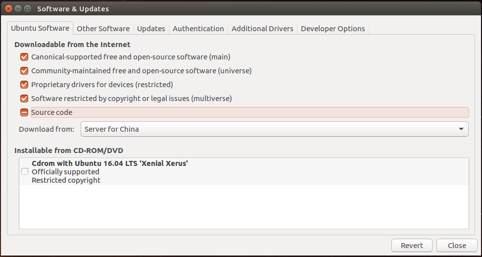 打开后按照下图进行配置(确保你的”restricted”, “universe,” 和 “multiverse.”前是打上勾的):