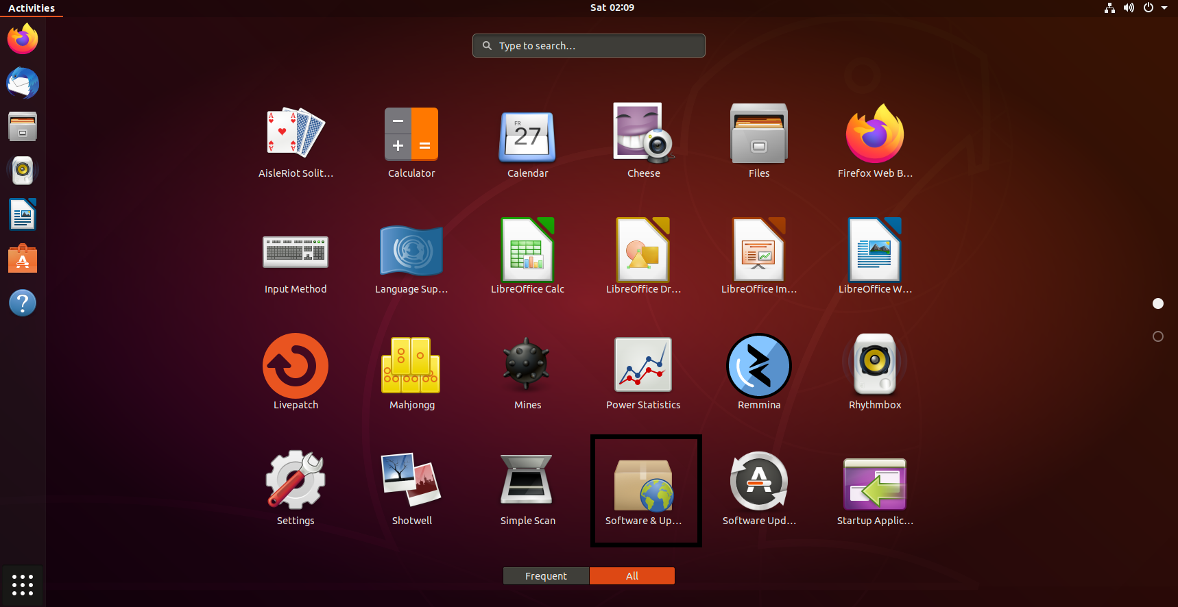 源这个概念可能对初学者比较陌生。大家都用过手机的应用市场吧,我们可以从应用市场下载APP在我们的手机上面便捷的使用,在Ubuntu系统下,我们也是有一个“应用市场”——apt。在我们需要下载程序的时候,sudo apt-get install 软件名即可进行安装。源,软件源,也就是这个软件仓库的数据,我们可以通过sudoapt-getupgrade更新我们的一个“应用市场”中已经安装好的所有软件;源列表呢,就是你这个“应用市场”里面都有哪些软件,是软件名称的一个列表。(PS:以上表述可能并不完全正确,但是对于初学者入门是足够的。有兴趣的朋友可自行查阅相关资料。) 我们点击Ubuntu左下角的9个点,这个是类似于Windows键的一个功能,找到 softwave & update选项,打开。