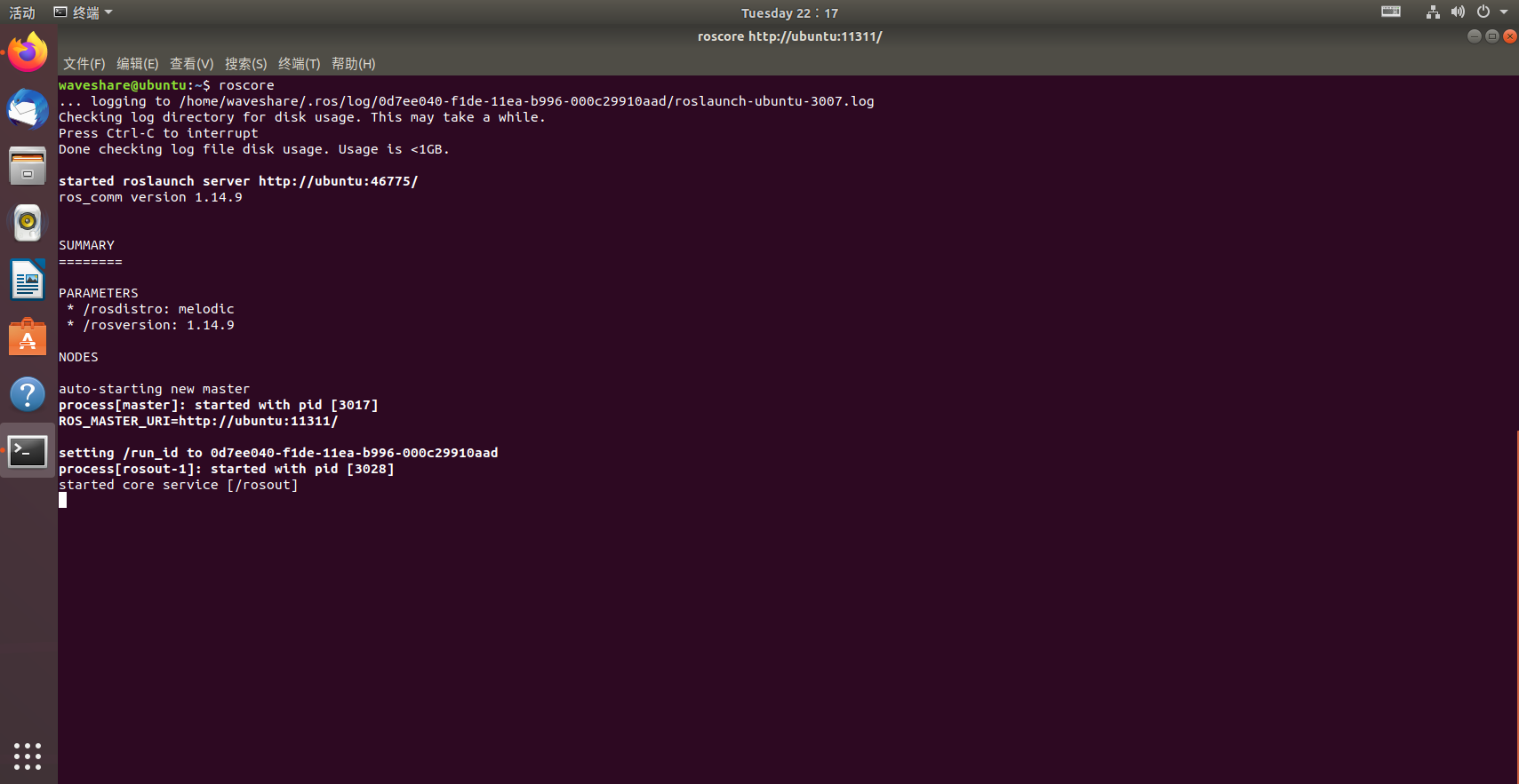 在ROS环境安装好了以后,相信你一定迫不及待的要体验一下ROS系统了吧!不过不要着急,机器人系统的设计是需要大量的时间和精力的,在这里我们先使用一个ROS的欢迎程序来向大家展示我们的ROS系统。 ROS系统的启动需要一个ROS Master,即节点管理器,我们可以在终端输入roscore指令来启动ROS Master。