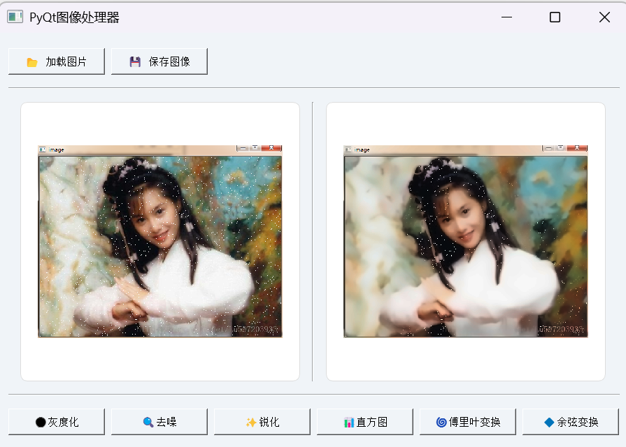同样地,可以尝试点击其他按钮,如 “去噪”“锐化” 等,观察不同处理算法对图像产生的影响。每个处理操作都是对原始图像的独立操作,处理后的结果显示在右侧,方便与原始图像进行对比分析。