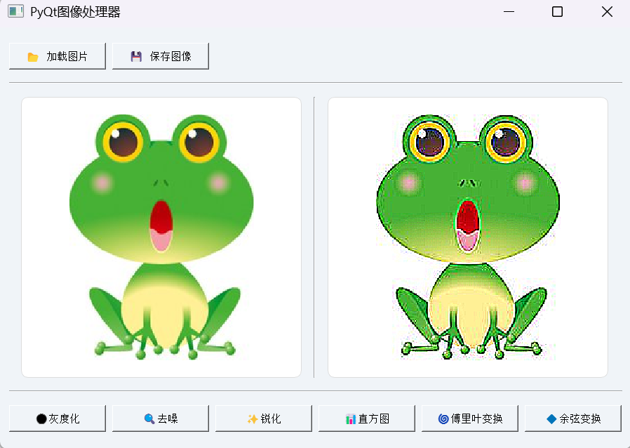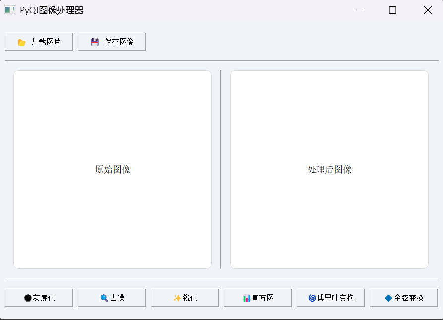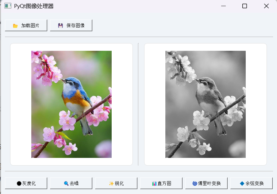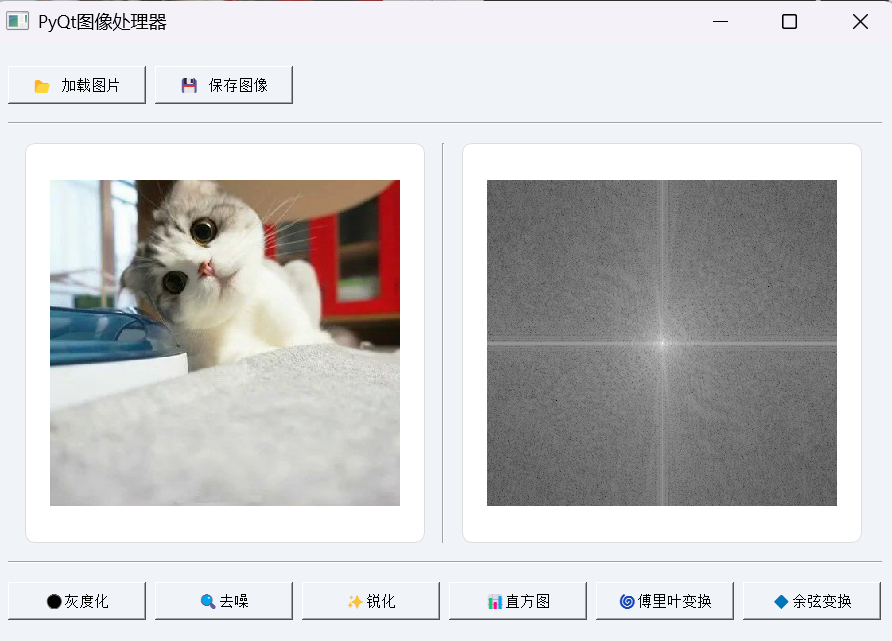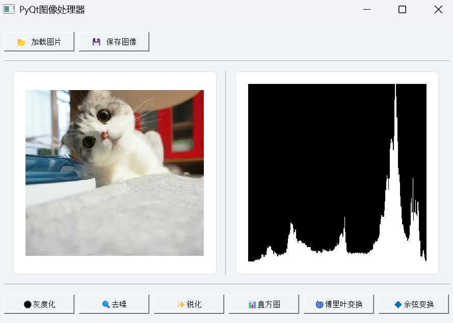 这段代码实现了一个功能较为全面的图像处理工具。它能够加载本地图片文件,并对图片进行一系列常见的处理操作,如灰度化、去噪、锐化、显示灰度直方图、离散傅里叶变换(DFT)以及离散余弦变换(DCT)。处理后的图像可以清晰地显示在界面上,同时还可以将结果保存到本地,方便我们对不同处理效果进行对比和分析,对于学习图像处理原理以及实践操作都非常有帮助。