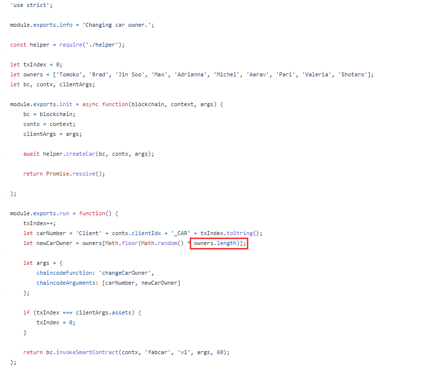 下面这个截图是changeCarOwner.js的,owners是一个数组,为了读取它的长度,但是报错说没有这个属性,因此将这个owners.length 直接改成了长度的数值10。其他两个文件类似的修改。