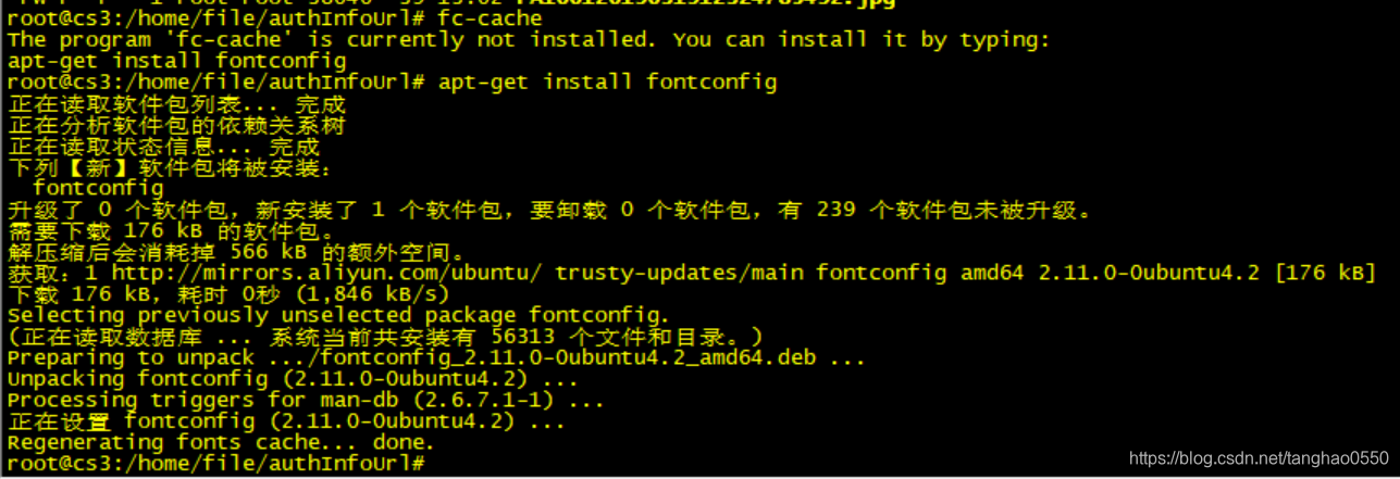 如果出现上图,说明没有安装fontconfig命令,输入apt-get install fontconfig,安装