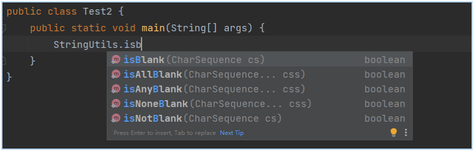 isAllBlank、isAnyBlank、isNoneBlank与isAllEmpty、isAnyEmpty、isNoneBlank功能相似,不举例子了。
