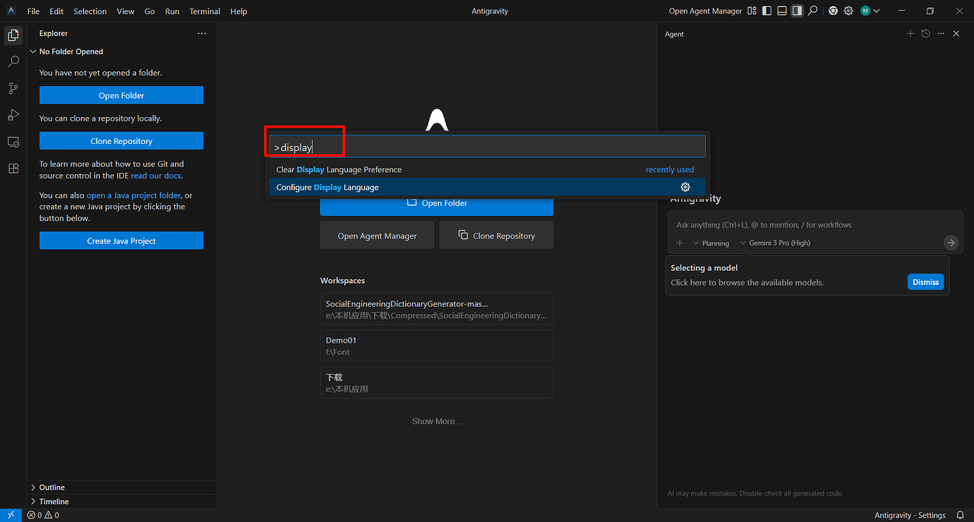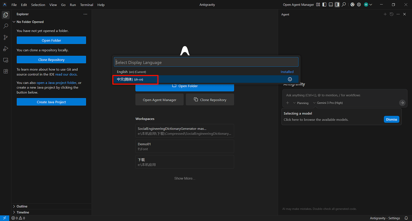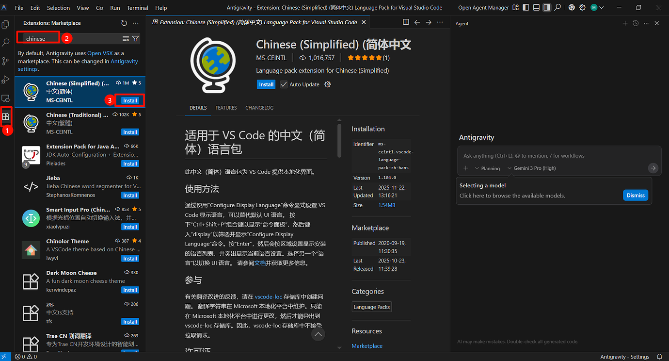 1.打开 Antigravity 1.1 界面左边点 Extensions 扩展(竖排第六个图案)搜寻 Chinese 安装,重启软件。 1.2 按下 “Ctrl+Shift+P” 组合键以显示 “命令面板” 1.3 输入 “display” 1.4 筛选并显示 “Configure Display Language” 命令 ↑、↓键选择后敲回车键 (Enter) 1.5 敲 “回车键 (Enter)” 选择中文 - 等待重启 2. 完成