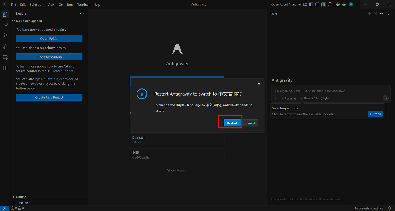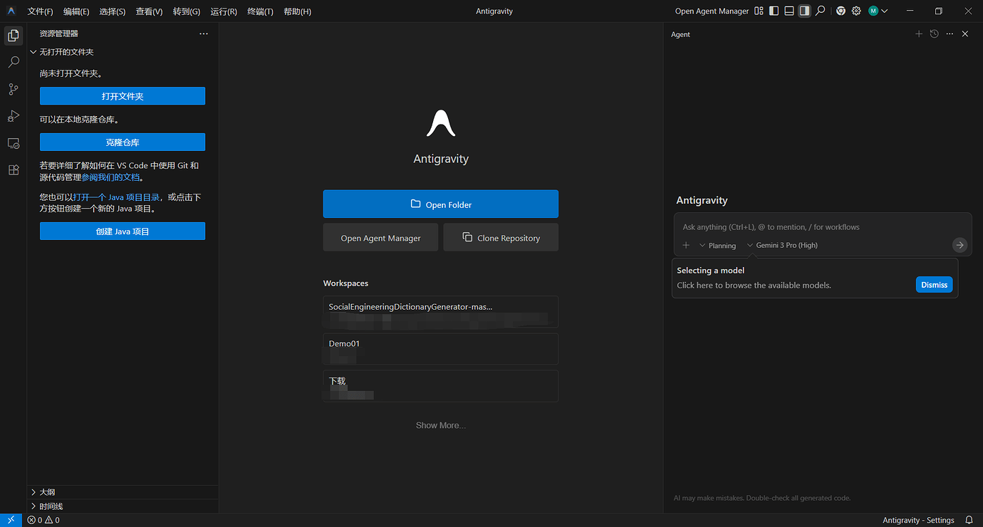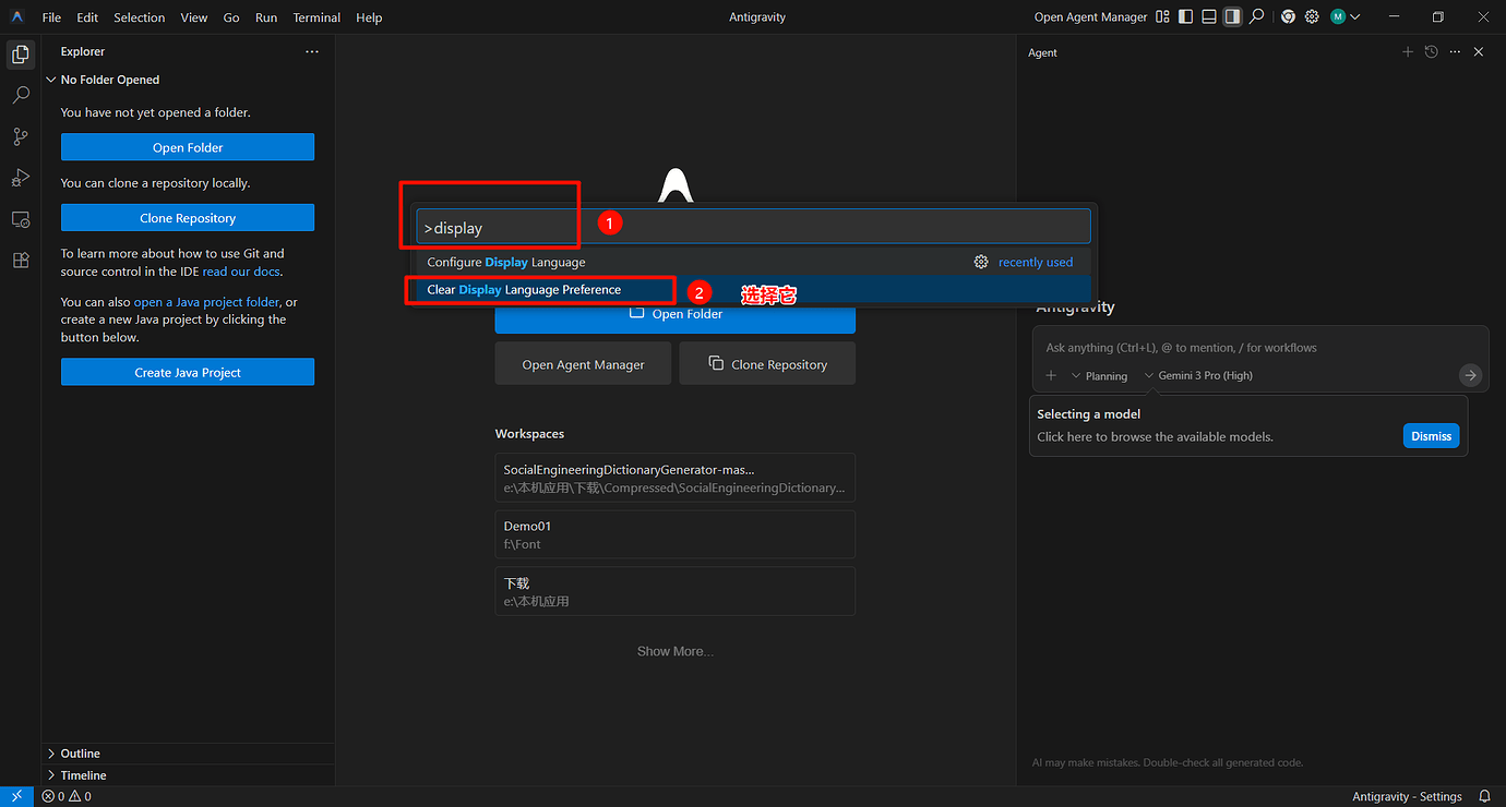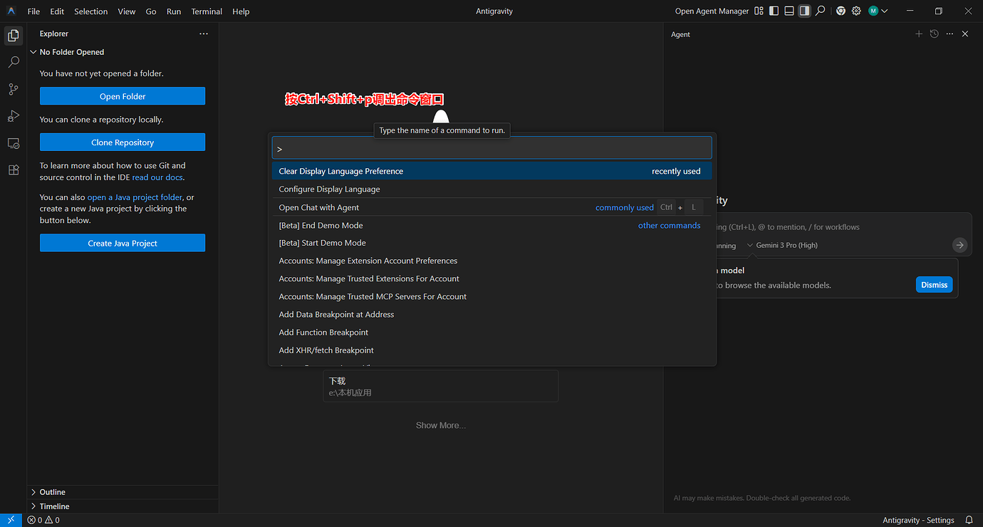 1.打开 Antigravity 1.1 界面左边点 Extensions 扩展(竖排第六个图案)搜寻 Chinese 安装,重启软件。 1.2 按下 “Ctrl+Shift+P” 组合键以显示 “命令面板” 1.3 输入 “display” 1.4 筛选并显示 “Configure Display Language” 命令 ↑、↓键选择后敲回车键 (Enter) 1.5 敲 “回车键 (Enter)” 选择中文 - 等待重启 2. 完成