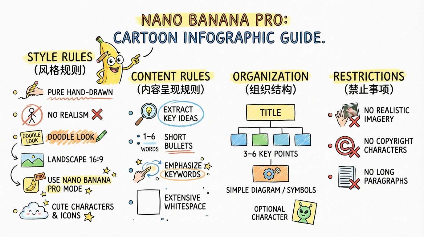 Create a cartoon-style hand-drawn infographic with the rules above, using nano banana pro, based on the following content: