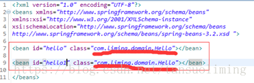 <bean id="hello" class="domain.Hello"></bean>